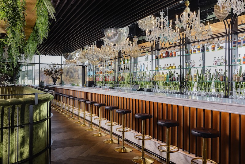 The design is opulent: fifty gorgeous chandeliers gathered from antique stores across Europe, an oak and Carrara marble bar, stone tables with brass details, oak veneer wall panels. A special eye-catcher is the relief concrete wall designed with interference motifs.
