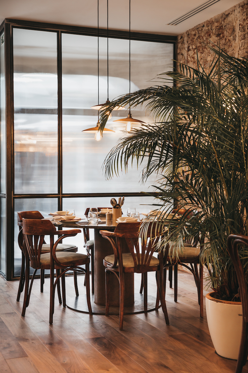 For example, there fantastic pancakes, oysters with ginger, lemon gel and trout caviar, ice cream of red tea with sesame oil. The room also looks stunning: raw walls, subtle colors, bistro tables with marble tops, lots of plants and an open kitchen that allows guests to watch the virtuosos at work.