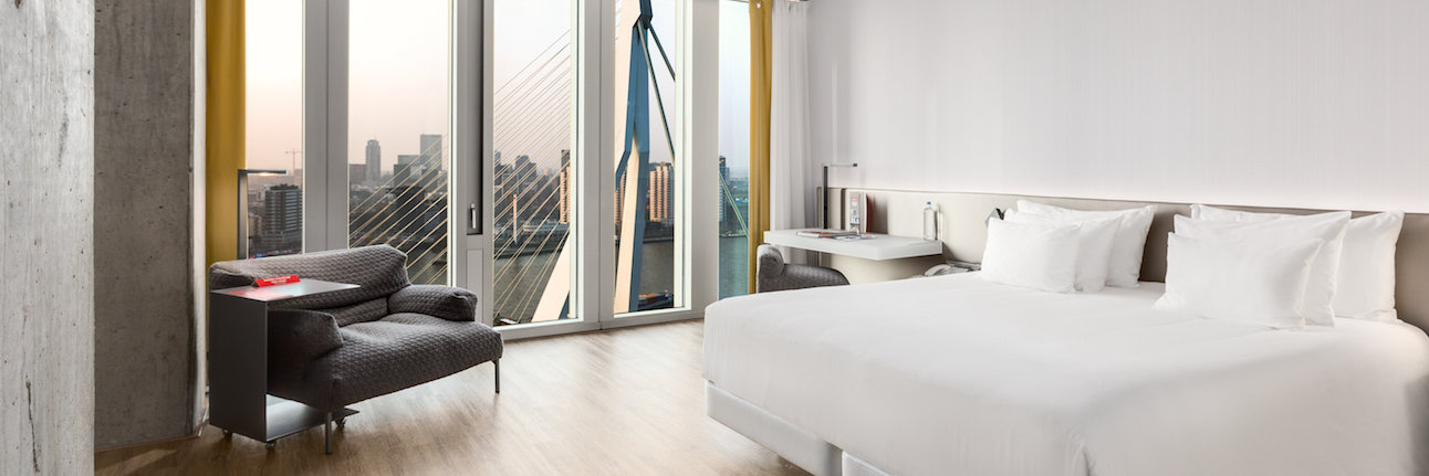 The proximate surrounding of a hotel building could not be more exciting: We are talking about the De Rotterdam, Rem Kolhaas’ iconic building that connects three towers.