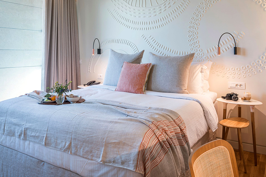 The hotel is already unique for one reason: Whether on the roof terrace or during a bath innen of the freestanding tubs, guests can enjoy the grand view onto the Parthenon, the 2500 year old temple of the goddess Athena on the Acropolis, everywhere. Certainly exhilarating.