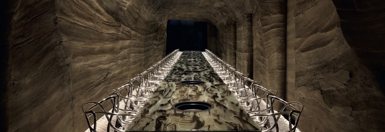 The Nikunotoriko stretches across two floors. In the first floor, an over-dimensional table is placed in a cave-like setting. The second floor is not less unconventional. It offers intimate ground seating as well as steel pipe elements with tree designs that resemble subtle room separators.