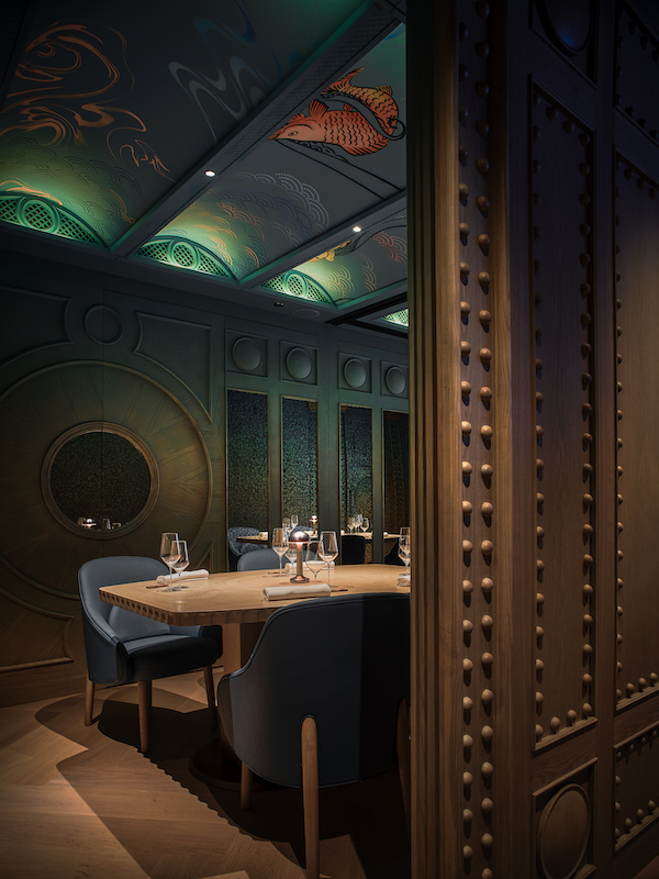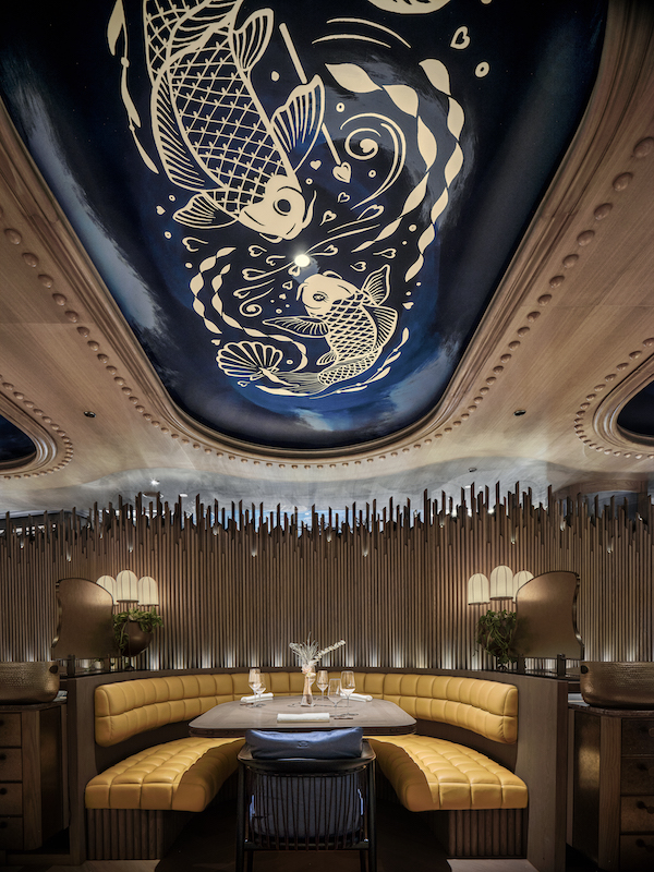 “Italian Silhouette”, the main dining room inspired by traditional Italian motifs, features a rich material and color palette of deep blue, bronze, dark wood, leather, fluted glass and silver travertine. Guests will find comfort in the curved bench seating overlooking the open kitchen with Japanese tiles and bamboo screens.