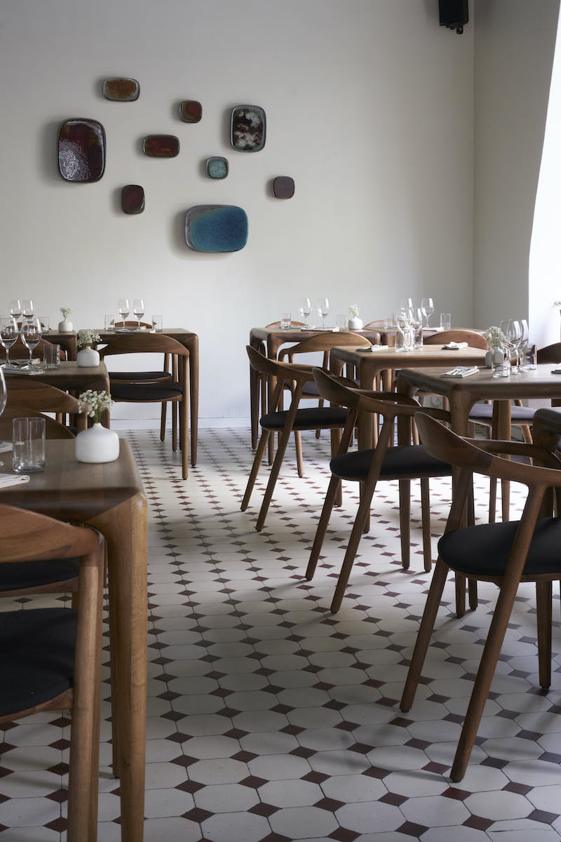 That is why everything is completely processed here; what remains is composted and turned into fertilizer that goes back to the producers of the produce. These are strictly regional and are only allowed to be delivered without packaging. Napkins are made of recycled plastic bottles, the glasses of water bottles that are collected at the Finnish presidential palace, the handmade chairs are made of old walnut trees.
