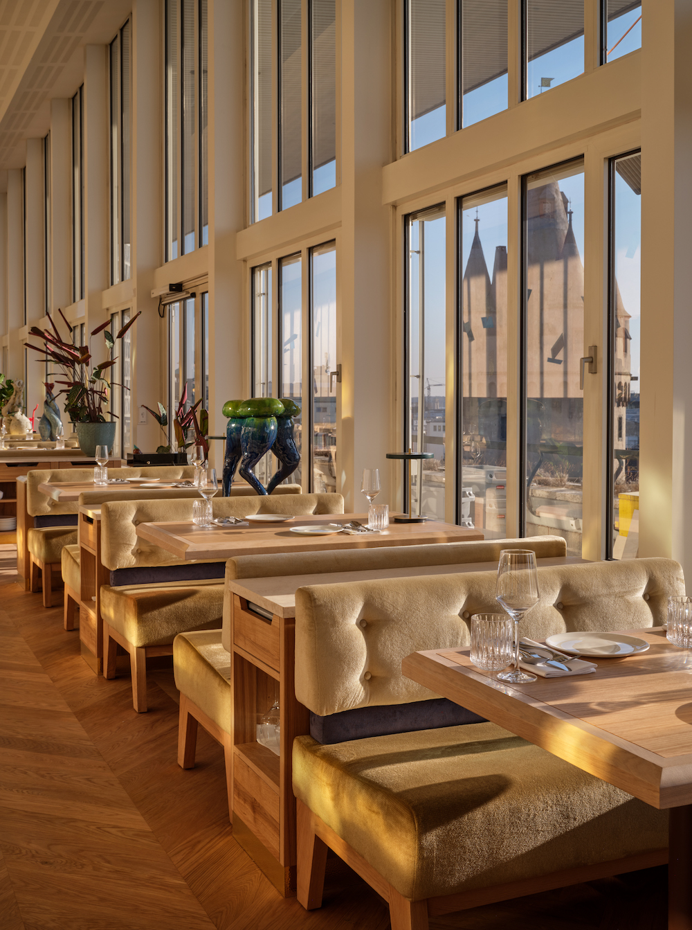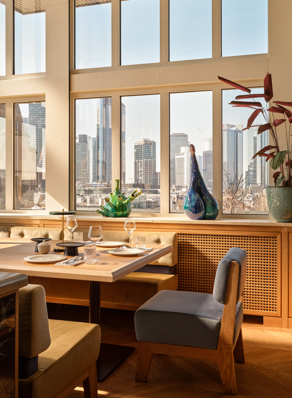 The Occhio d’Oro is located way on top in the landmarked Flemings Selection Hotel. A huge window area offers a great view of Frankfurt’s skyline, while an expert material mix of Travertin, marbled natural stone, hand-blown glass objects and oiled oak assure an authentic atmosphere.