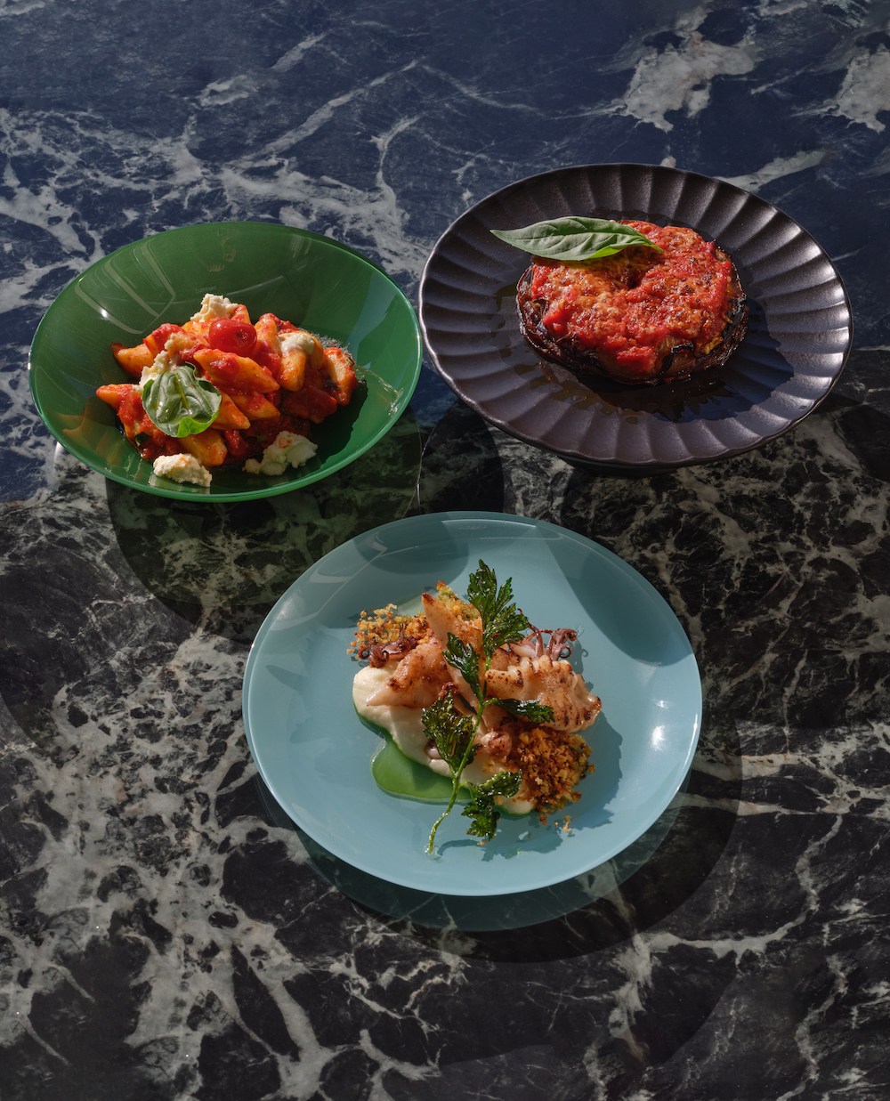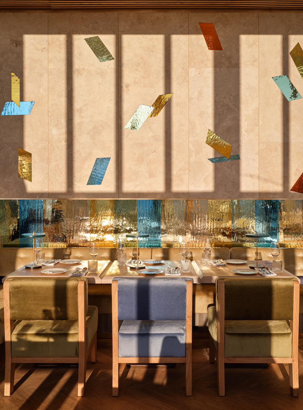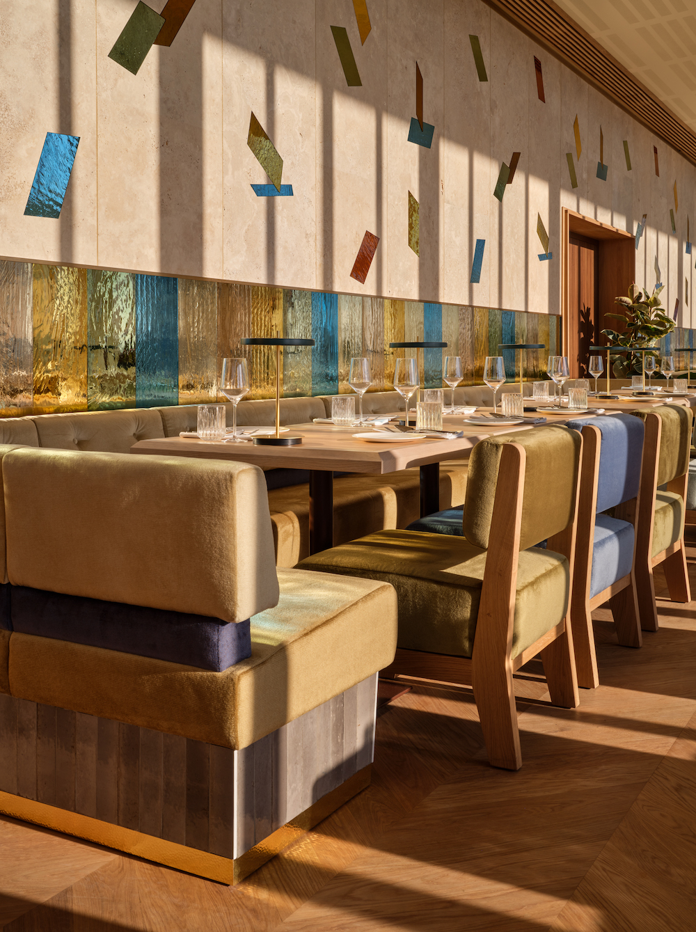 Everything here is Italian: starting with the Tuscan regional cuisine, to the chairs and benches upholstered with Rubelli fabric and the green marble tiles on the free.standing bar. The mid-century design of the 60s was the source of inspiration for the relaxed yet elegant interior.