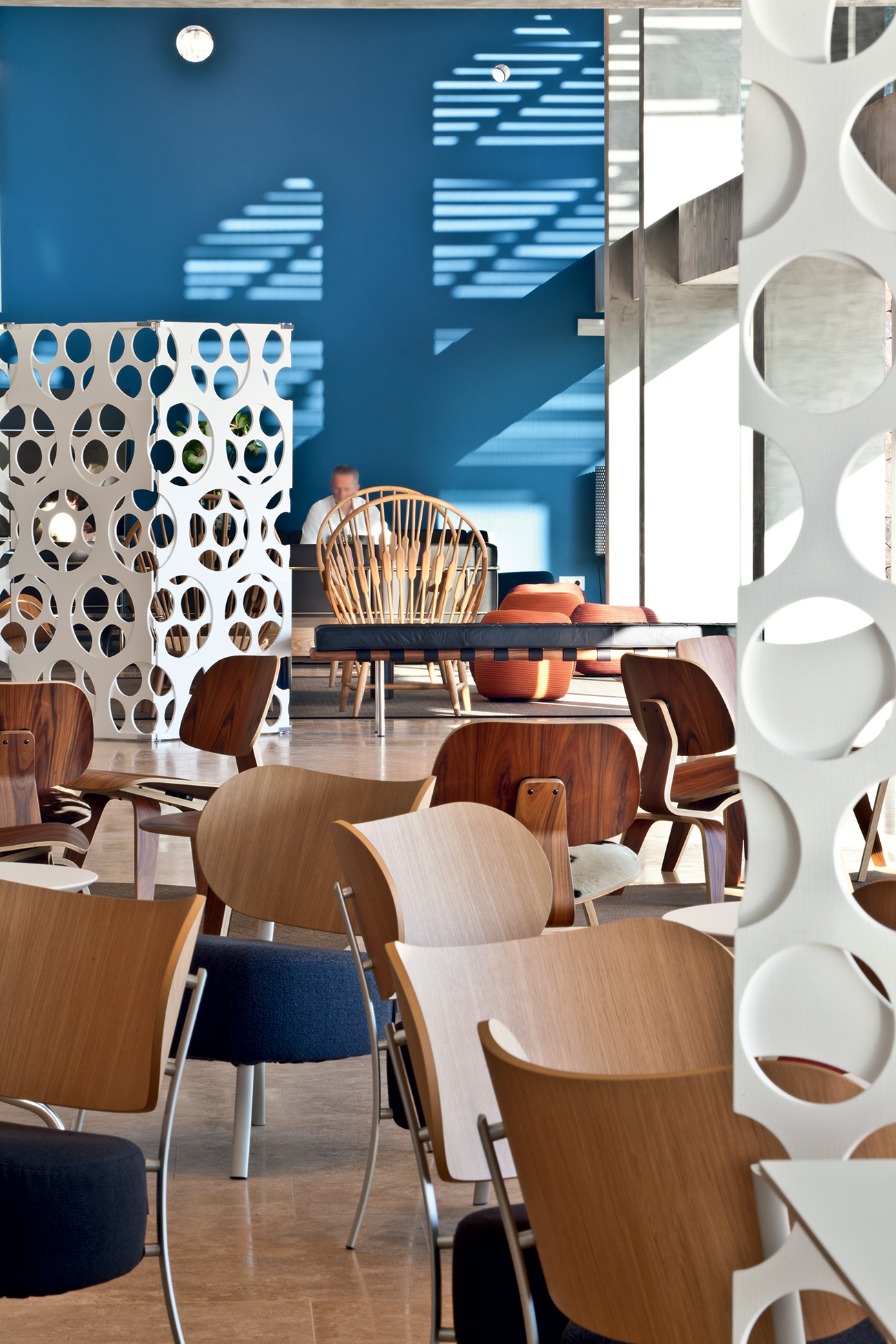 Die Nähe zu Mallorcas exklusivem Hafen Puerto Portals war namensgebend für das Hotel. Das Gebäude strahlt in Weiß, der untere Teil der Fassade wurde farblich akzentuiert. Verspielte Sonnenschutzelemente in Weiß, Blau und Ockertönen werfen diffuse Schattenbilder ins Innere. Das Anliegen des Architekten Victor Rahola Aguadé und der Designerin Mayte Matutes war es, das mediterrane Feeling an diesem Ort spürbar zu machen. Licht- und Schattenspiele erzeugen Spannung. So auch im Restaurant- und Bar-Bereich, in dem weiße, gelöcherte Trennwände sich vor einer blauen Wand absetzen.