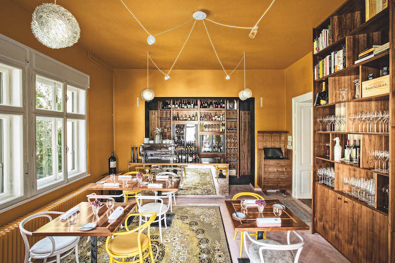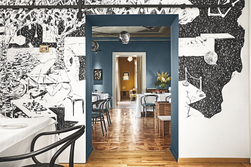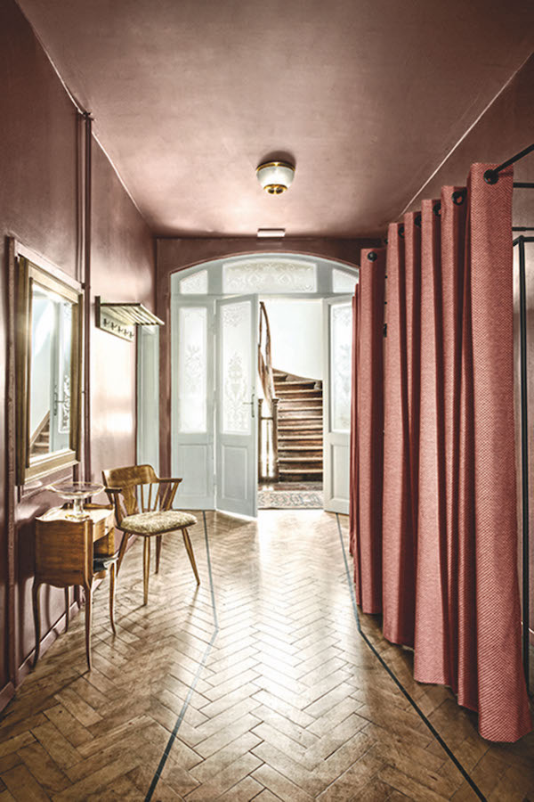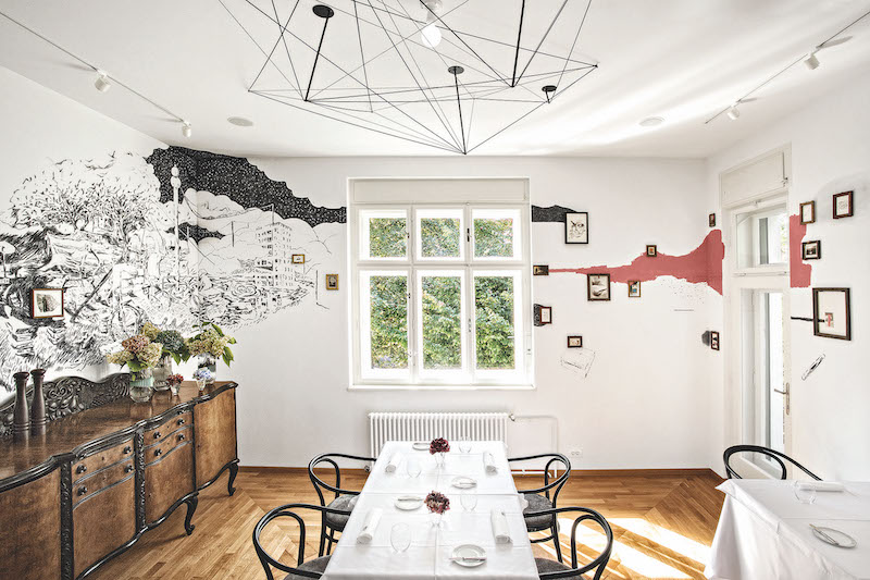 The blue dining room was named after a ceiling fresco discovered during the remodel. Matej Stupica’s “White Room” is a veritable synthesis of the arts: it shows scenes, views and objects from the turbulent history of this house, which for decades was mainly frequented by writers and artists.