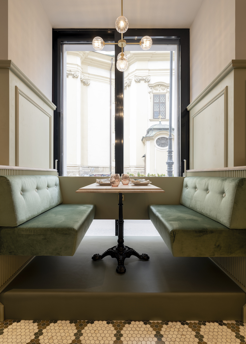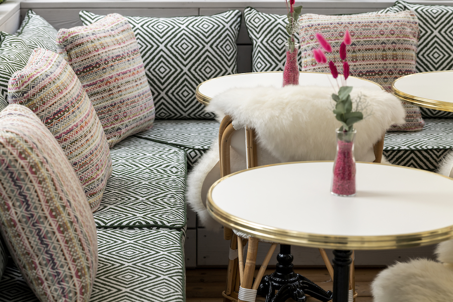 The interior is similarly light as the cuisine (the restaurant concept wants guests to combine several small meals just like along the Mediterranean):  Light pistachio green on the walls, mosaic tiles on the floors and plush seats in the inside as well as hip Ika print outside also assure that the eyes get fed.