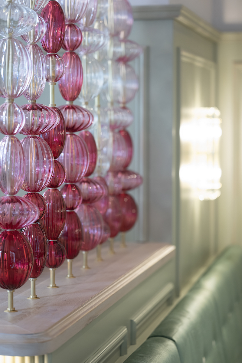 The lass folding screen in pink and purple shades was designed by Austrian glass artist Robert Comploj.