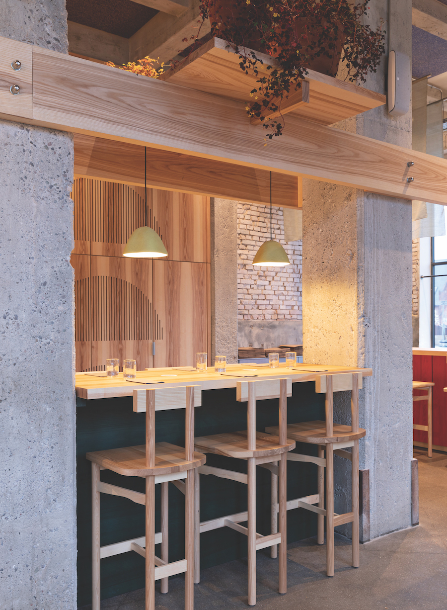 For the design of the former storage space, Spacon & X combined concrete pillars and raw brick with poppy red, moss green and soft yellow; the archaic-looking wooden chairs were custom made by Frankfurt’s brand e15.