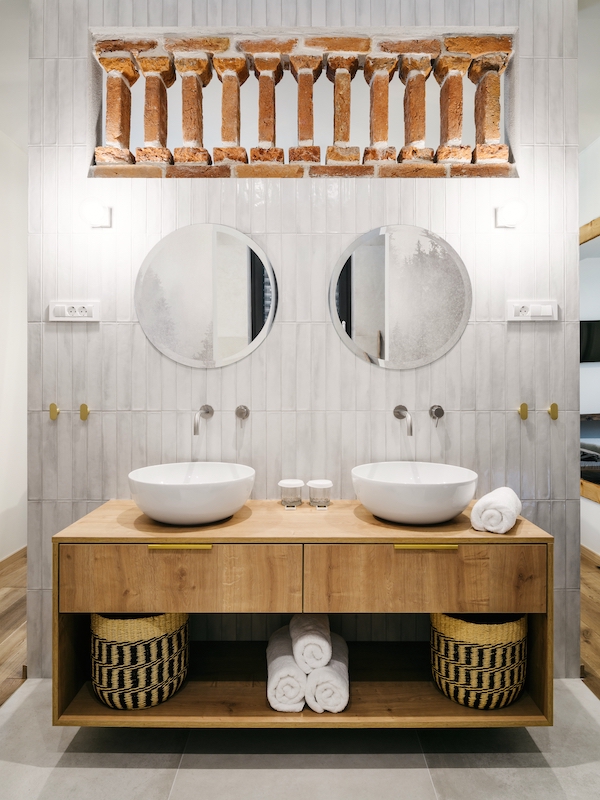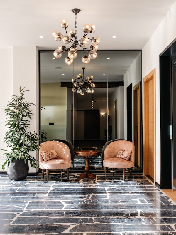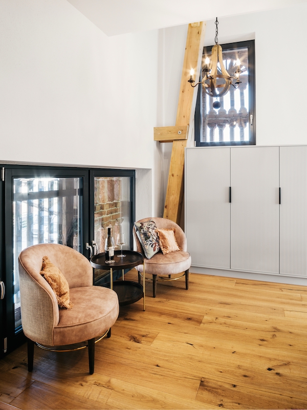 Custom-made furniture is a matter of course. POKE studio’s interior designers have incorporated elements of the original building into the interior design – in the form of black natural stone, masonry details of the facade, and old beams that have been transformed into pieces of furniture.