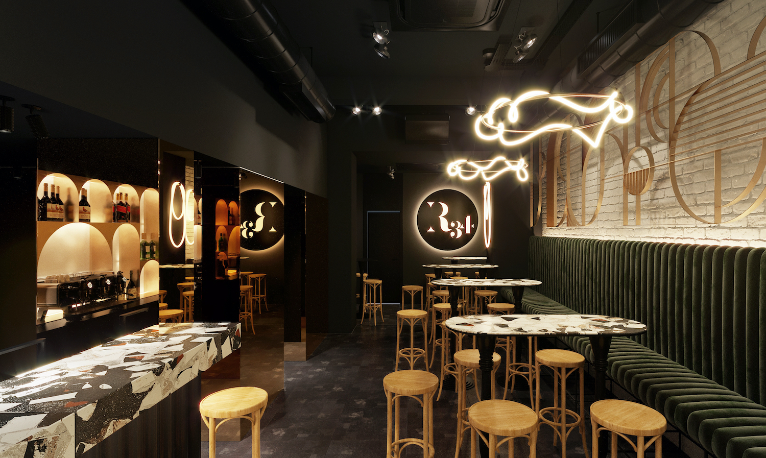 The society hotspot not only attracts with great cocktails but also with an exciting interior design: creatively set black and white contrasts, brass details on the walls and custom made chandeliers.