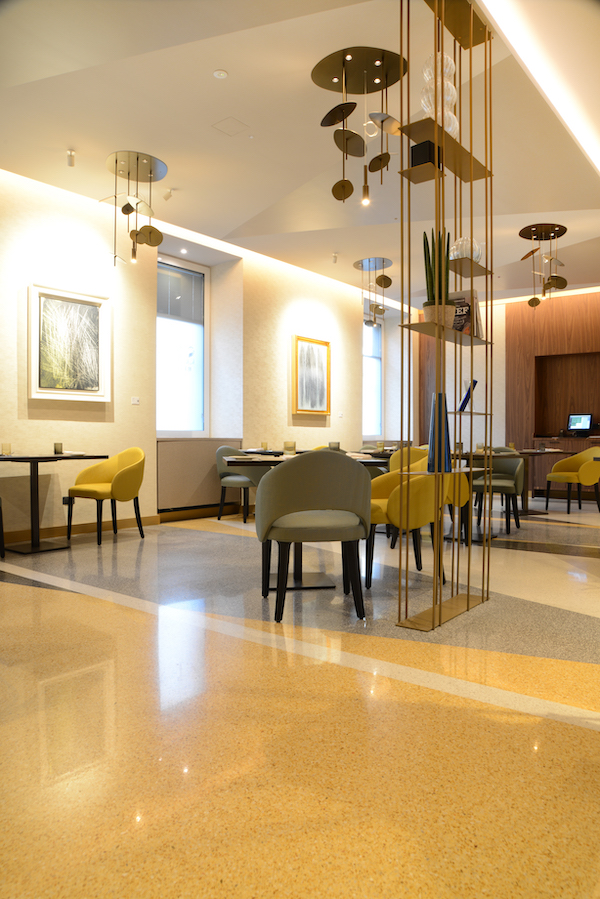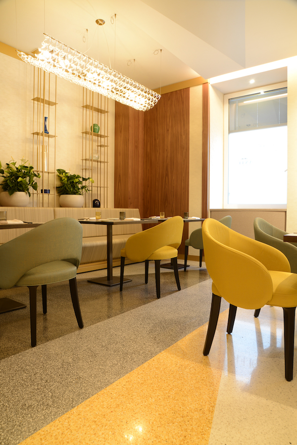 The influence of the 1960s runs through the entire interior – from the choice of typical materials such as walnut and the fabrics of the upholstered furniture to the wooden parquet floors and terrazzo. The geometric pattern of the restaurant floor and the color combination of yellow and grey hark back to the shapes and colors of the 1960s master Gio Ponti.