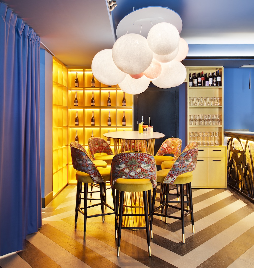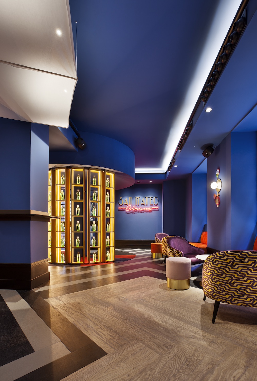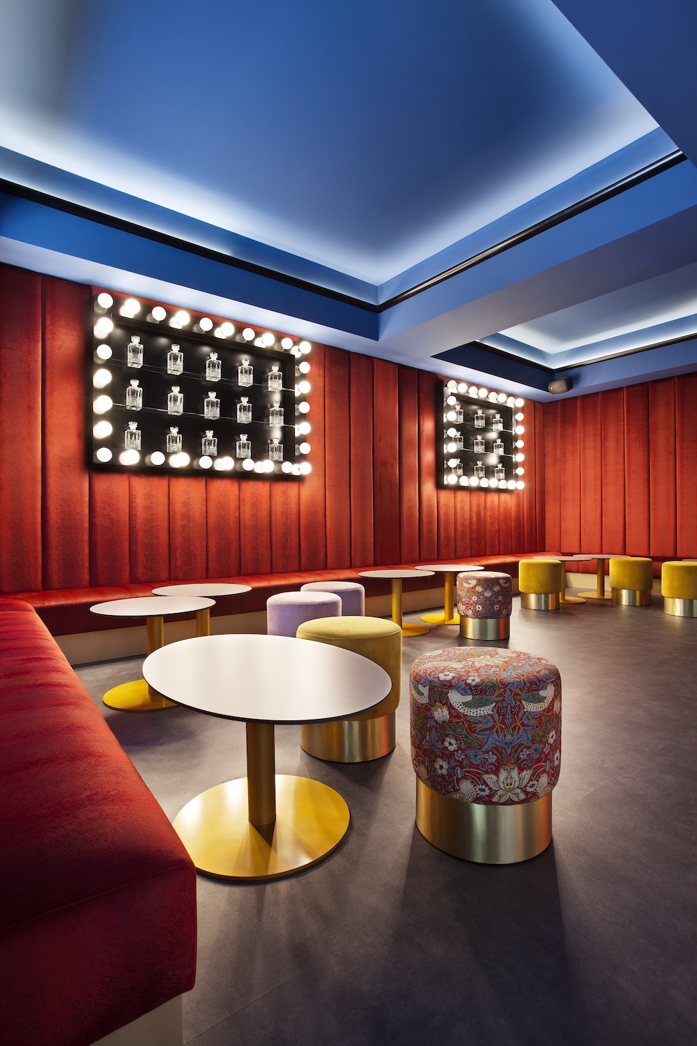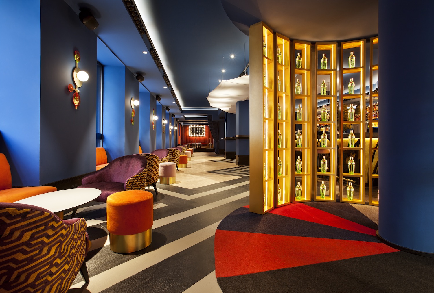 An emotional interior design project that is fresh and playful, happy, elegant but also refined all at the same time: For this bar, Studio Viteri/Lapeña sets on an illusional circus atmosphere of the 40s and further offers several Art-déco style elements. The result is a unique mix of furniture, lamps and cutlery including an Art-déco bar counter, a textile tent on the ceiling including exciting color explosions in the baths and with unusal lights for the background lighting of the VIP area. Studio Viteri/Lapeña also contributed an individually created cocktail menu and a new logo!