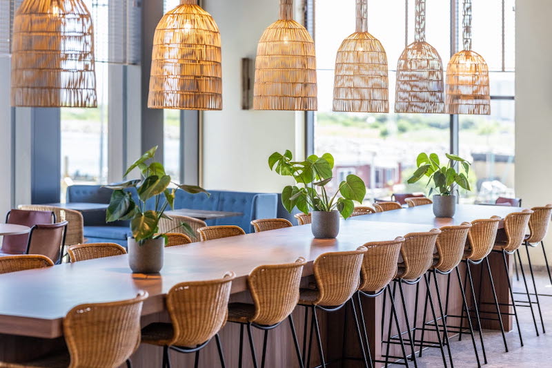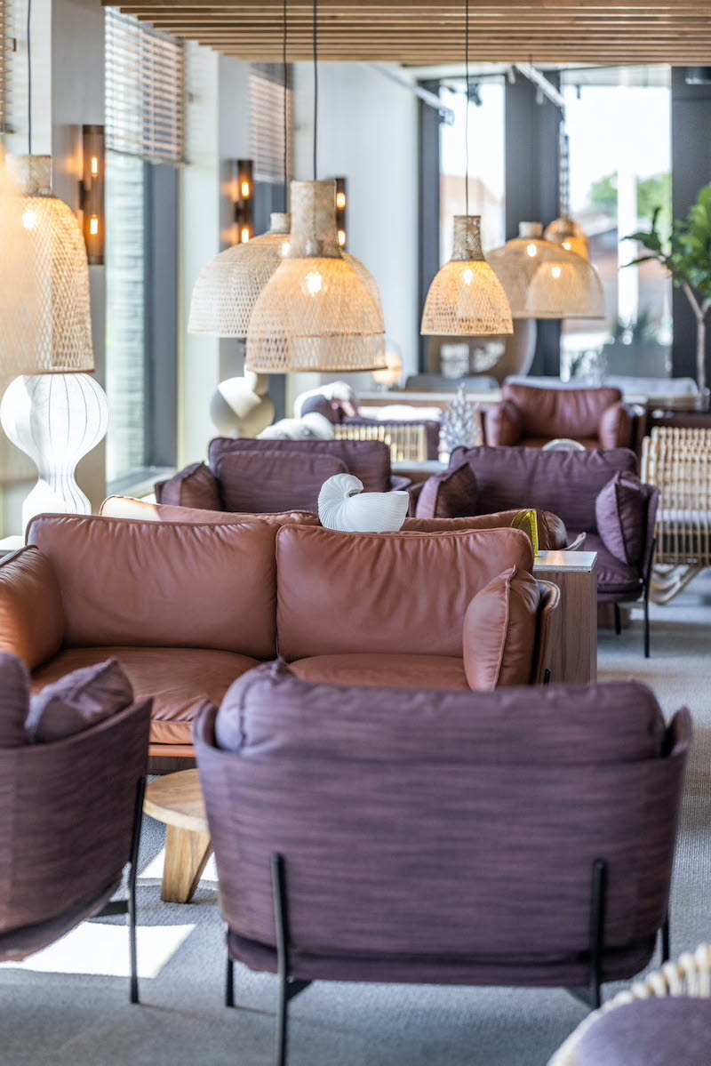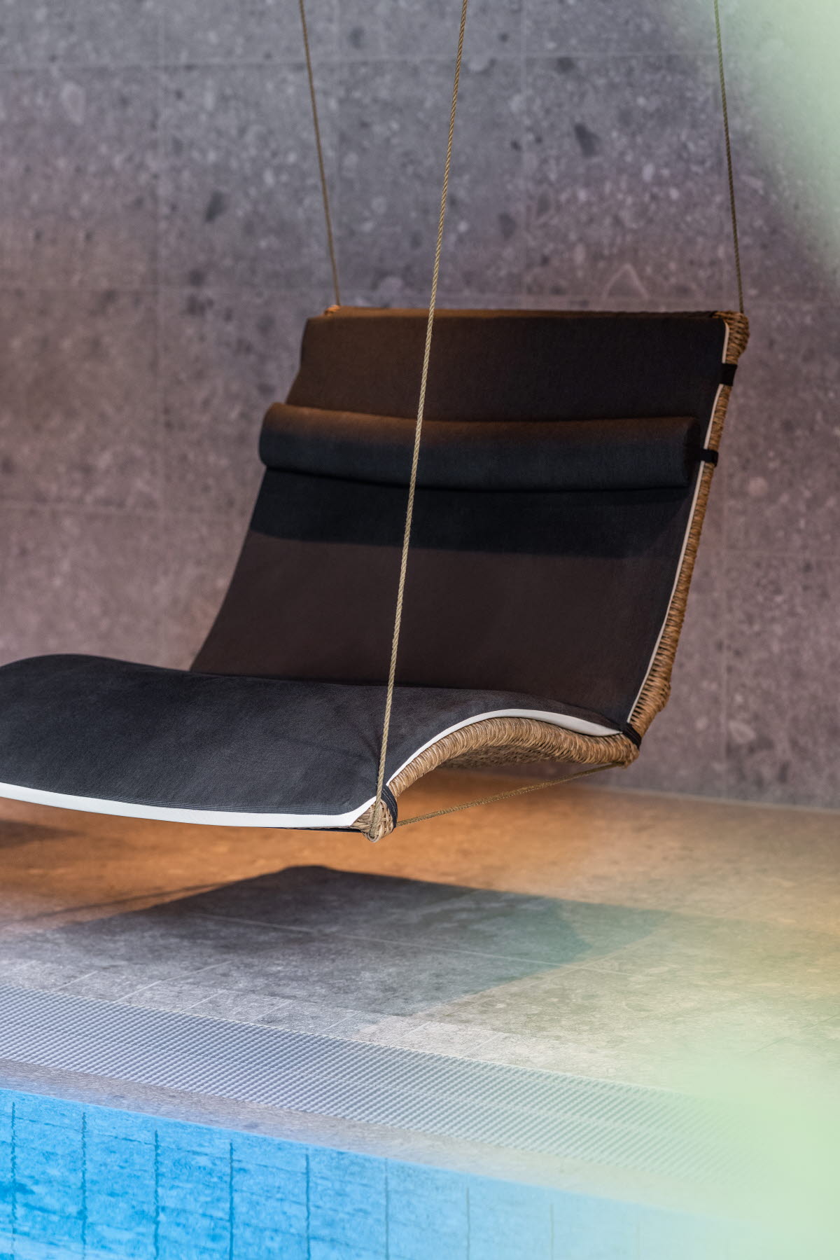 The Swedish Koncept Design Studio has brought the aqua theme from outside into the interior – materials such as rattan and straw evoke beach feelings, and the maritime atmosphere is completed by furniture in blue tones and gently curved lines in the shape of waves.