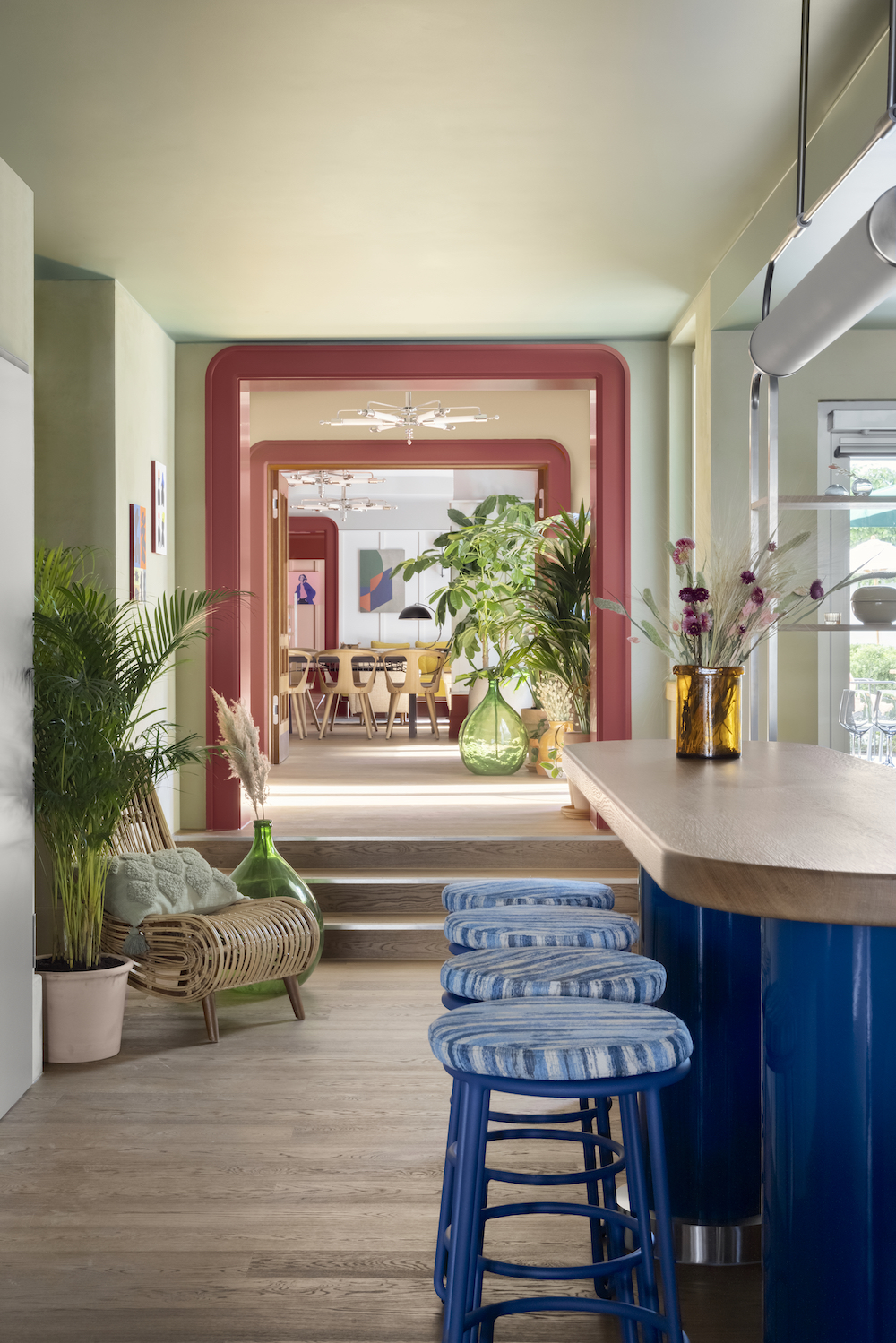 The interior design by interior design studio Fettle was inspired by the “Deutsche Werkbund” that was founded in Munich in 1907. Accordingly, the apartments were endowed functionally and without any frills. Curtom made furniture further meet the criteria regarding aesthetically and premium furnishings of the Werkbund. The whole thing is rounded off with a classic color palette as well as a great art collection.