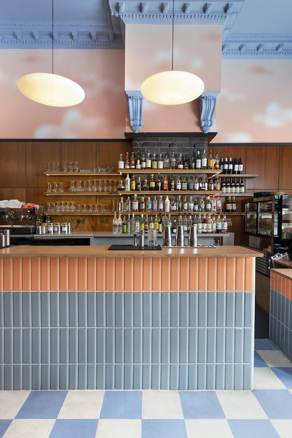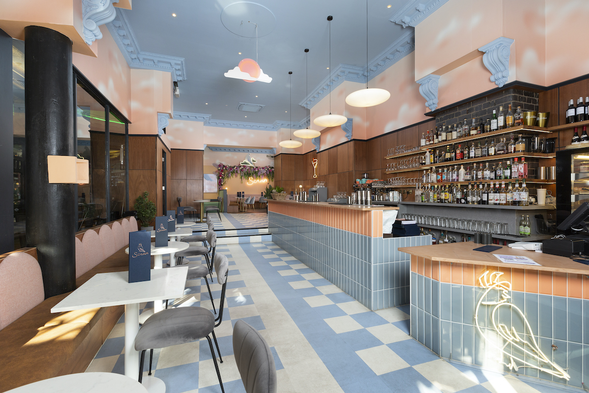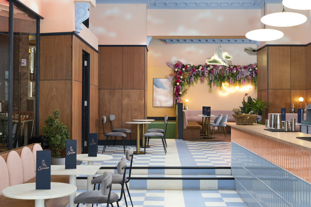 The interior, lovingly and subtly designed by Edinburgh design studio Ja!Coco!, is decidedly feminine, with pastel pink walls, decorative neon lights, huge floral installations, baby blue checkerboard floors and generally soft shapes with a gentle feel.
