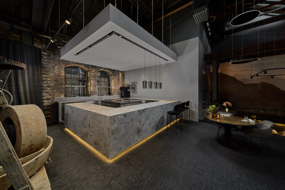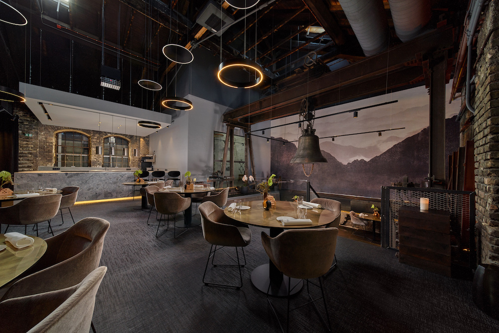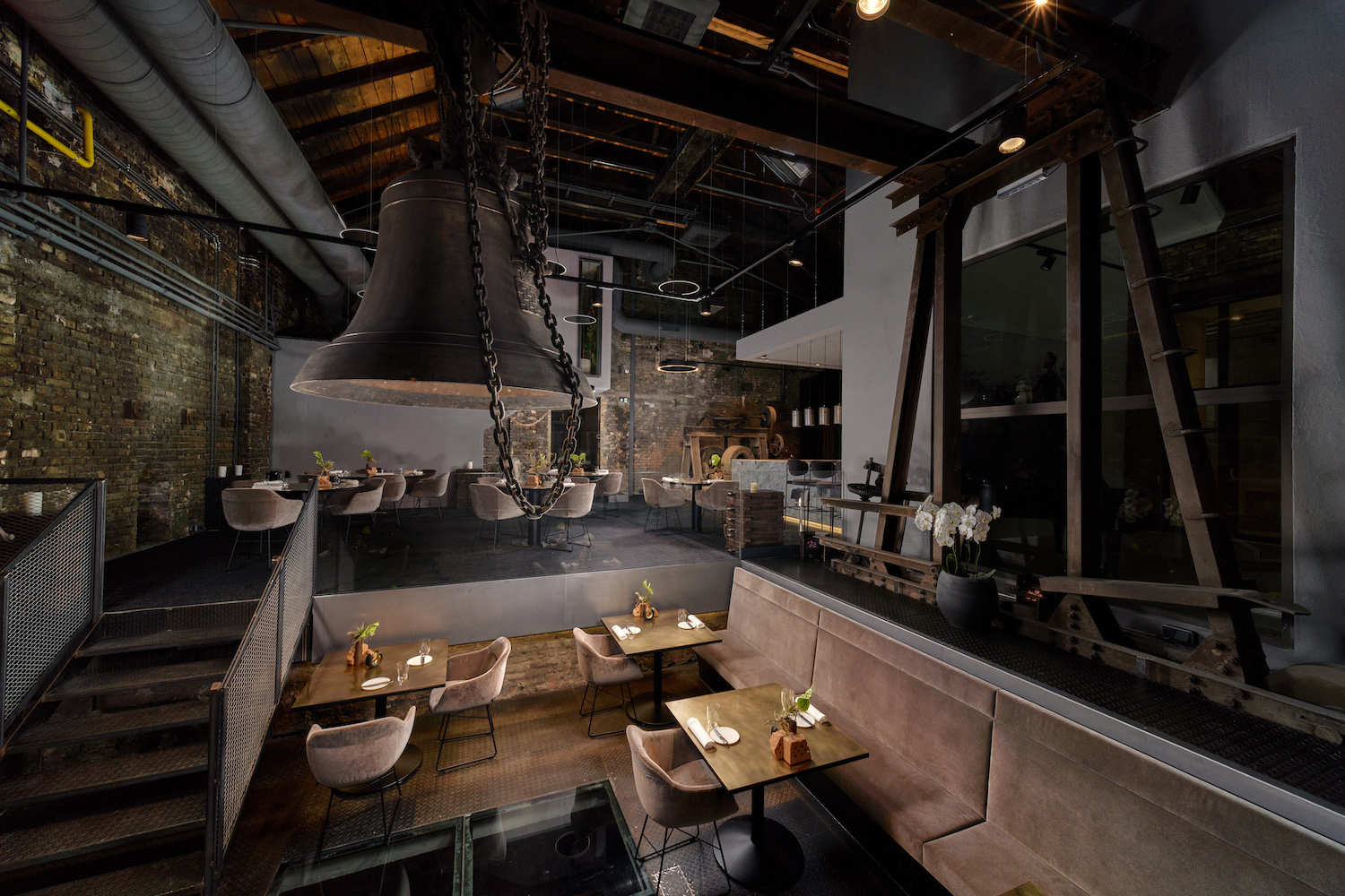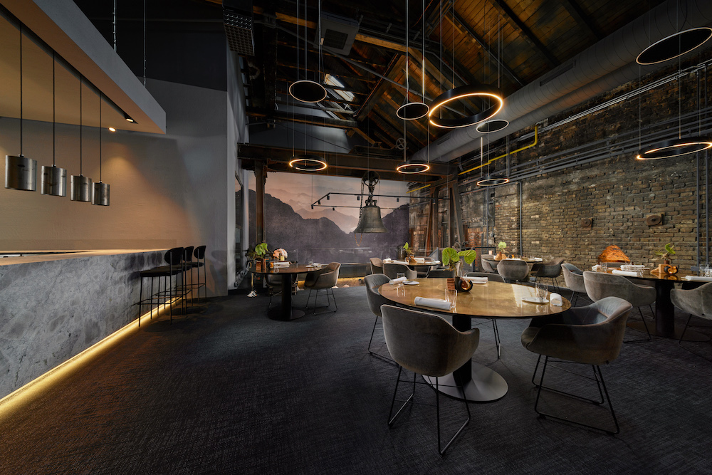 The new restaurant is still located in Salzburg’s Gusswerk and a mix of brick walls and modern interior elements still creates a cosmopolitan feeling. As a special effect, the last bell that was produced in the former casting house floats impressively over the glass floor. Further, the open kitchen was placed in the center of the restaurant in order to allow a peek at the action and culinary kitchen art.