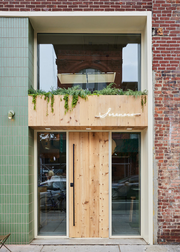 Sereneco is located on the first floor of the historic Pencil Factory Building, with striking green tiles on the façade and lots of light oak wood inside. Light-colored exposed concrete floors and raw brick walls match the industrial chic style.
