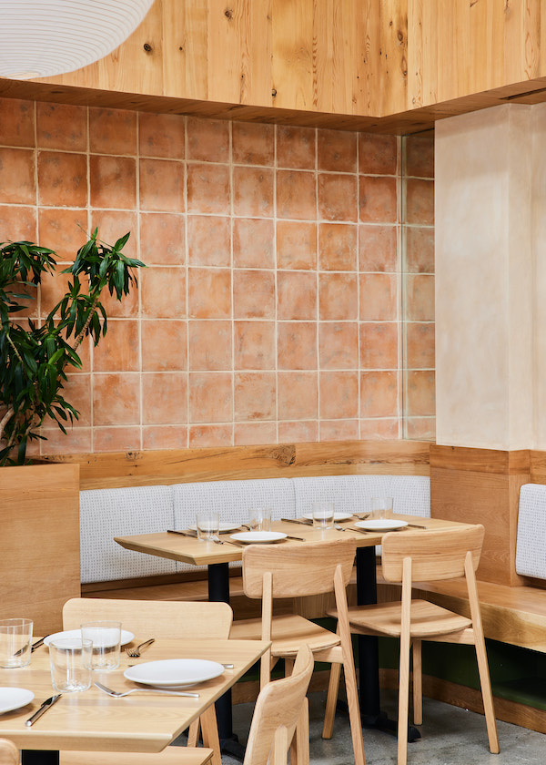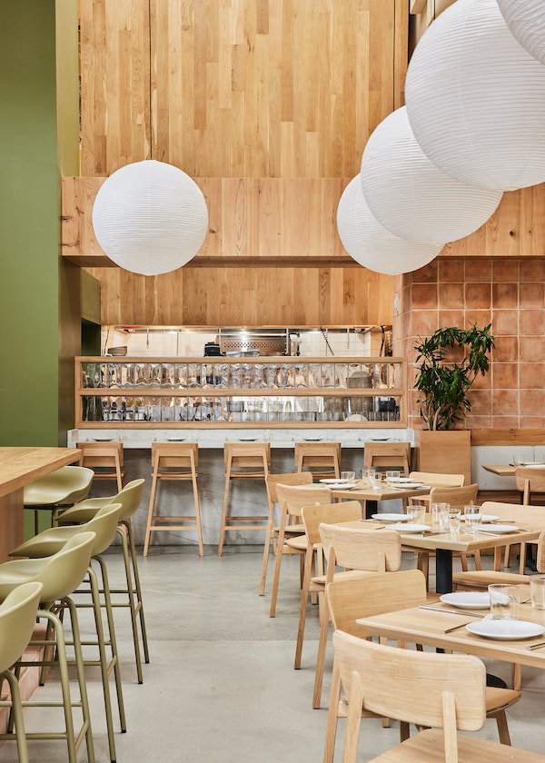 The Usonia architecture of the legendary mid-century hero Frank Lloyd Wright is a kindred spirit to the Esperanto that gives the restaurant its name – the interior designers at Carpenter + Mason borrowed from it and also paid their respects to the building itself.