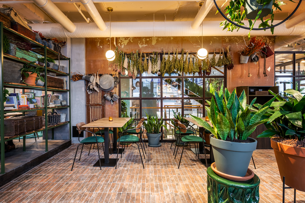 On top, landscape shots of renowned photographers, displayed on a large LED screen, are exhibited. But this place is not only about nature but also about great food. In the “Garden Kitchen” one can see the open kitchen, in the “Urban Picnic” area one can sit at the large community table or smaller ones – the only thing missing is a picnic blanket. Overall, the attempt is to minimize the ecological footprint.
