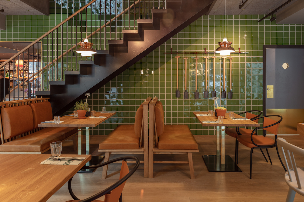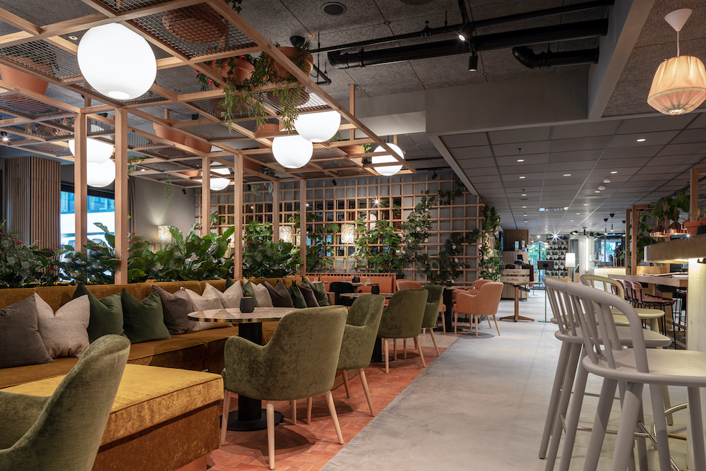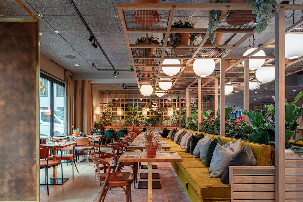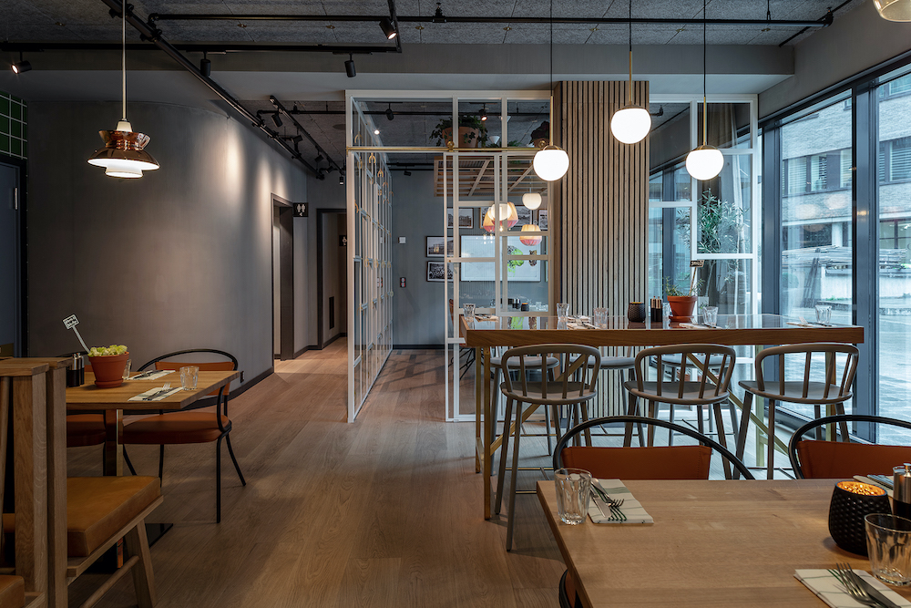In the past the Skabo Railway Car Factory was located where the hotel is now. In the inside of the restaurant, you can recognize the traces of the industrial history via brick tables and the ceiling with open pipes. But the restaurant also radiates a proximity to nature, seen with the used colors and plants.