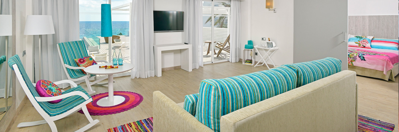 Wohnaccessoires, Bademäntel und Hoteluniformen kommen von der spanischen Trendmarke Desigual. Gäste können die Desigual-Artikel kaufen und erhalten sogar einen exklusiven Rabatt im Desigual-Onlineshop.