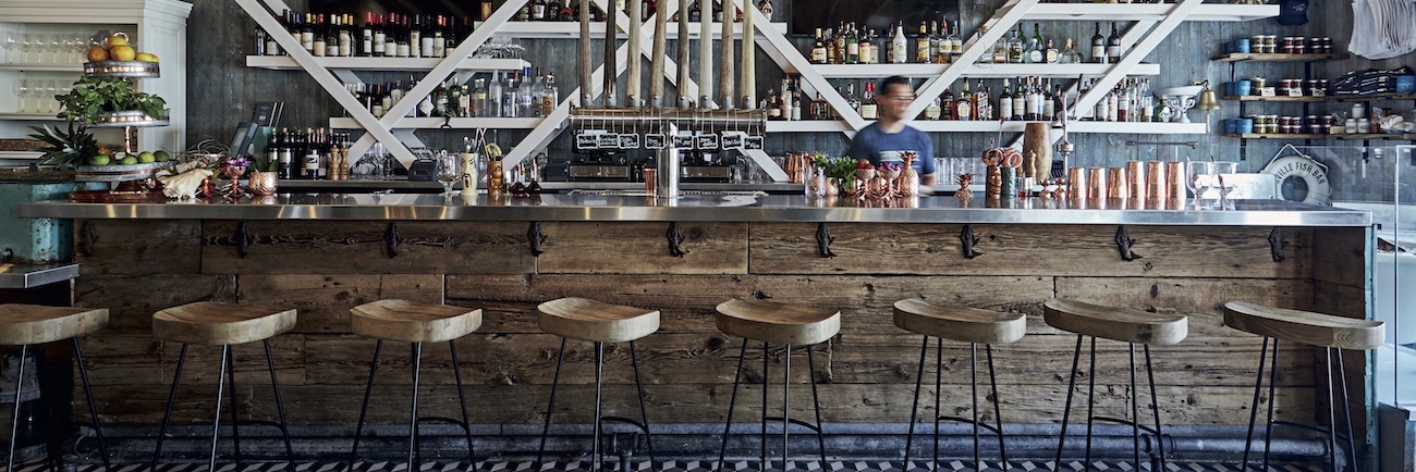 The two story high building of the Stiltsville Fish Bar is located on the Sunset Harbor and style-wise refers to childhood memories fo chef Mcinnes. They lead to the Texan Panhandle and the local fisheries.