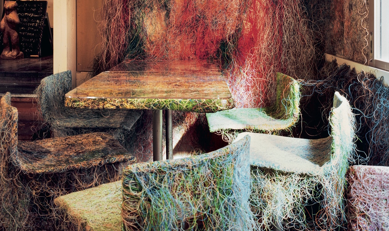 The Tetchan Yakitori Bar works with the aesthetic topic of absence economy and was mainly equipped with recycling materials. The LAN cables used for that are of course contemporary: the term Mojamoja refers to the woolen, torn up look of acrylic balls, a waste product that was used here. Interior designer Kengo Kuma used this approach consistently up to the design of the furniture.