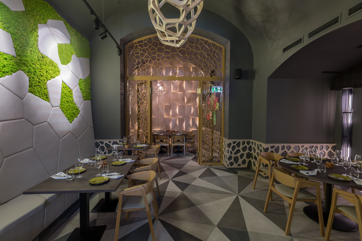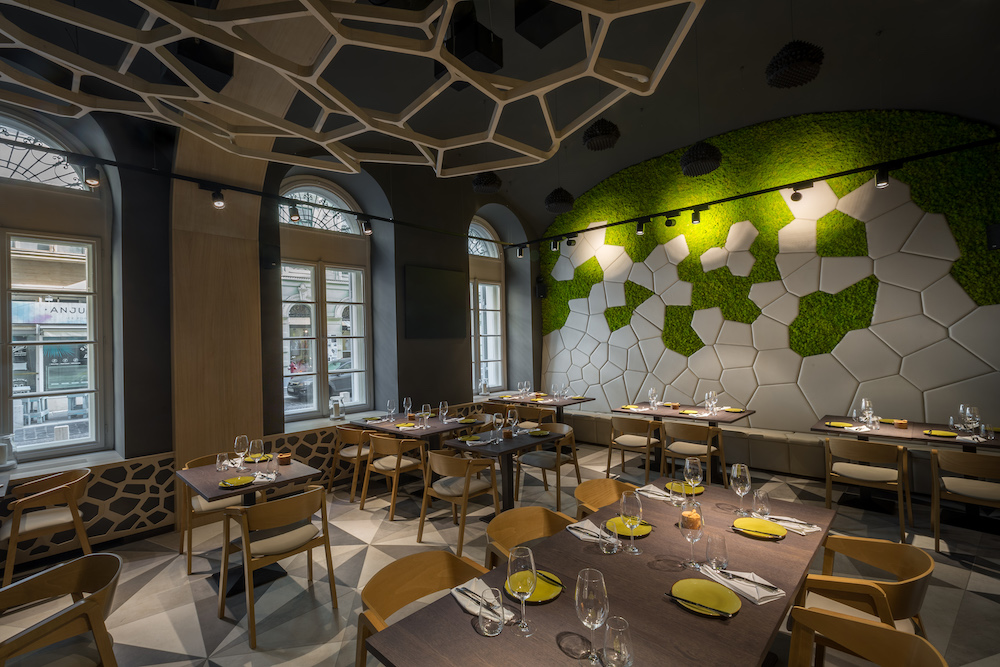 He combines local products and traditional cooking methods with techniques and ingredients from international cuisine. Exciting textures also mark the interior design. Natural patterns appear in macro and micro structures – on the seats, the tiles and the walls.