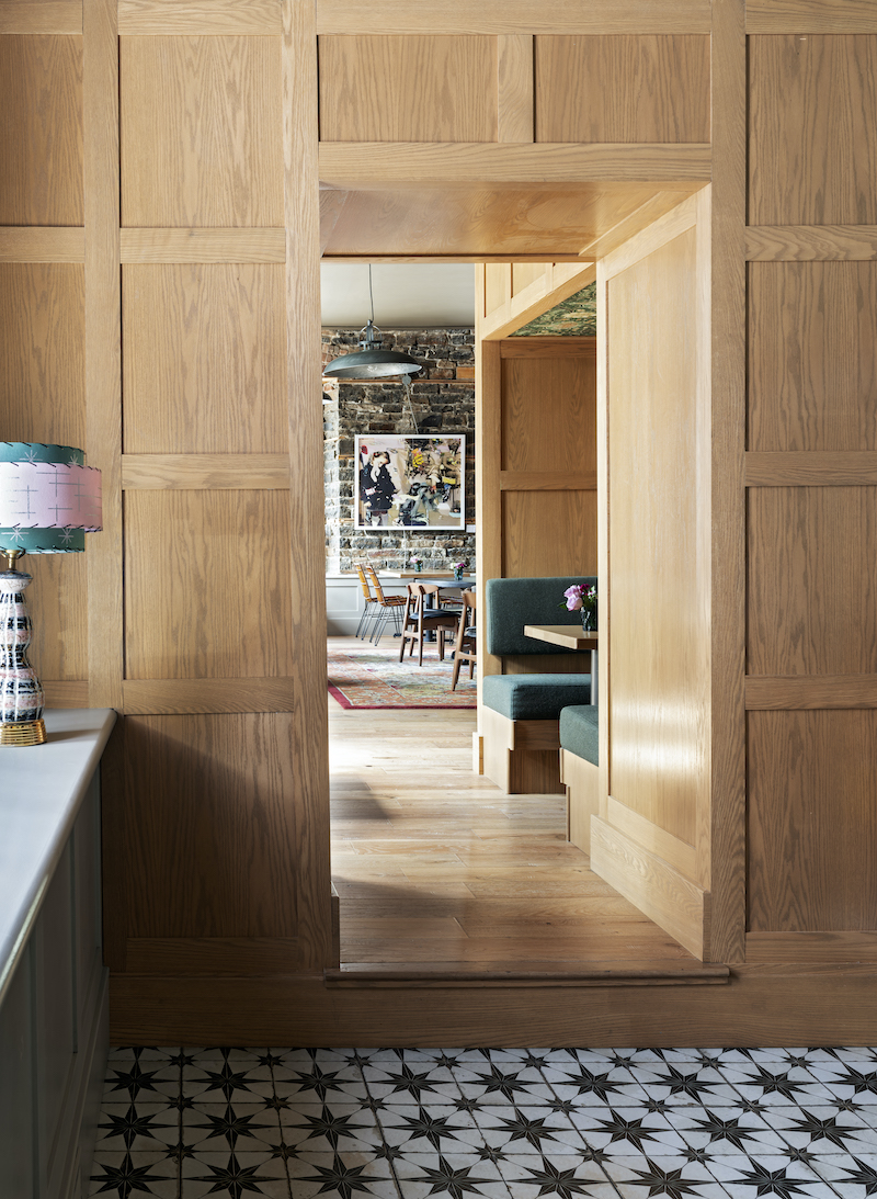 The white oak panels are a lighter version of the cafeteria walls she loved at Trinity College. The chosen floor tiles remind of Lisbon’s historic center.