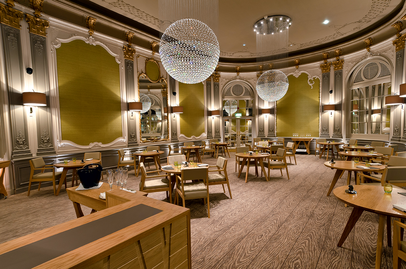 Restaurant owner Simon Rogan has been trained by the best: Marco Perre White and Jean-Christophe Novelli in England and Alain Senderens in Paris. His restaurant in the legendary Midland Hotel seats 50 people. Design Director Trudi Purtill worked with subtle colors; light woods, pastel wall panels as well as carpeting with a wooden pattern set a light frame. Two large chandeliers add to the friendly atmosphere.