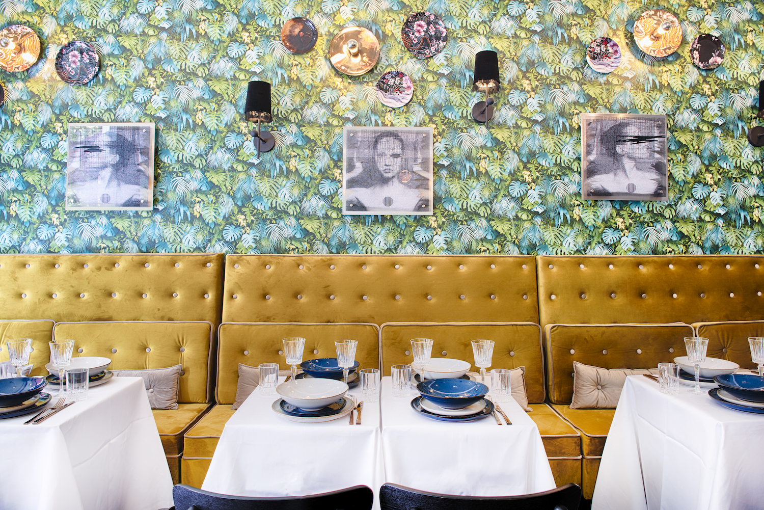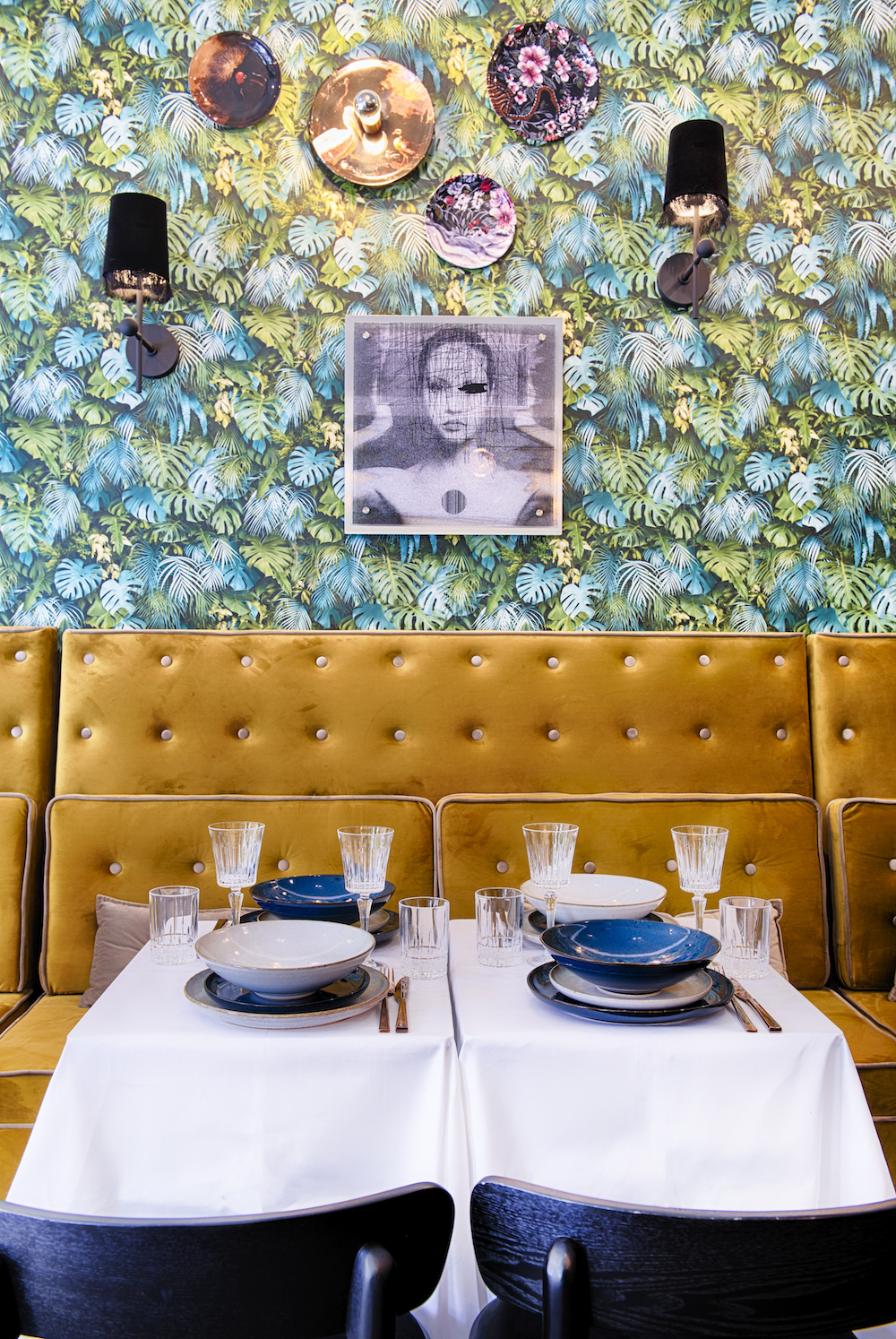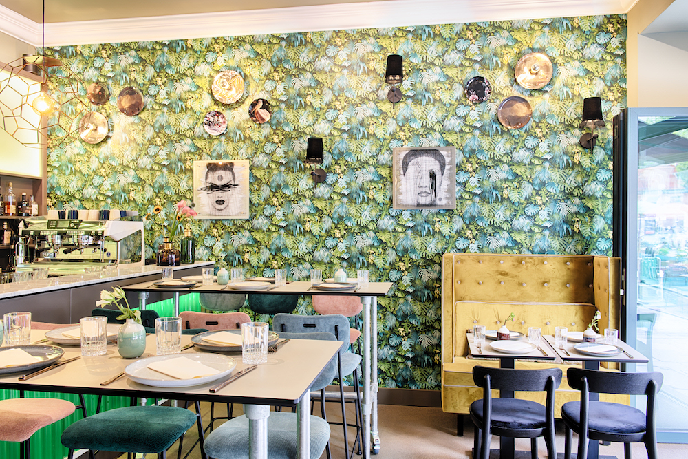 The vegan delights and the stylish interior go hand in hand and turn the visit into a holistic experience. One could claim that a fine blueberry cucumber salsa can be combined as elegantly with grilled avocado as the botanic wallpaper in deep green with the mustard colored upholstery furniture.
