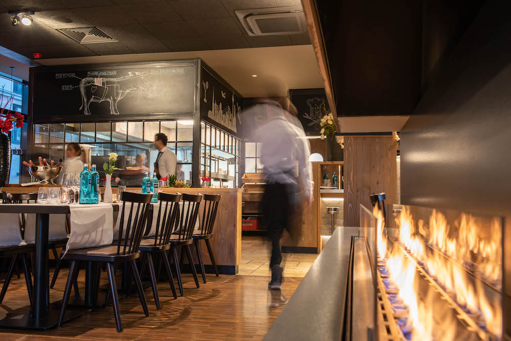 The open fire place in the middle of the room is the heartwarming center of the restaurant