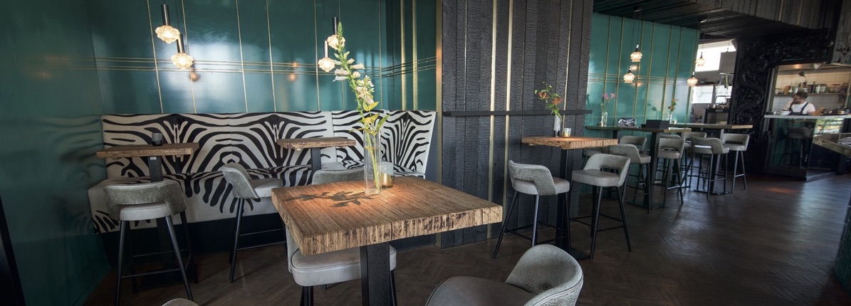 Only then emerald wall tiles await guests, a bar, gold framed marble tables as well as bar stools covered with faux snake leather and chairs with zebra prints Erst dann warten smaragdgrüne Wandfliesen, eine Bar, goldumrandete Marmortischchen sowie Barhocker mit Bezügen aus Schlangenlederimitat und Stühle mit Zebraprints auf die Gäste..