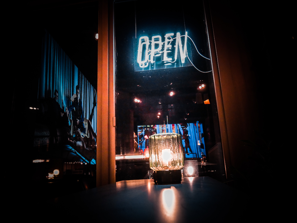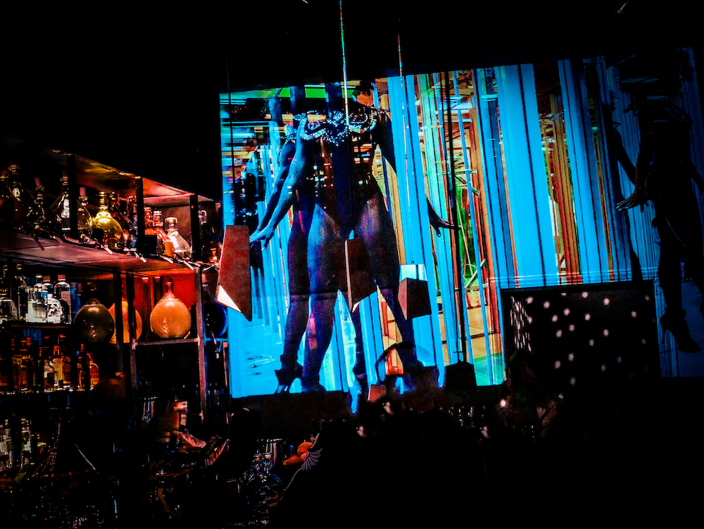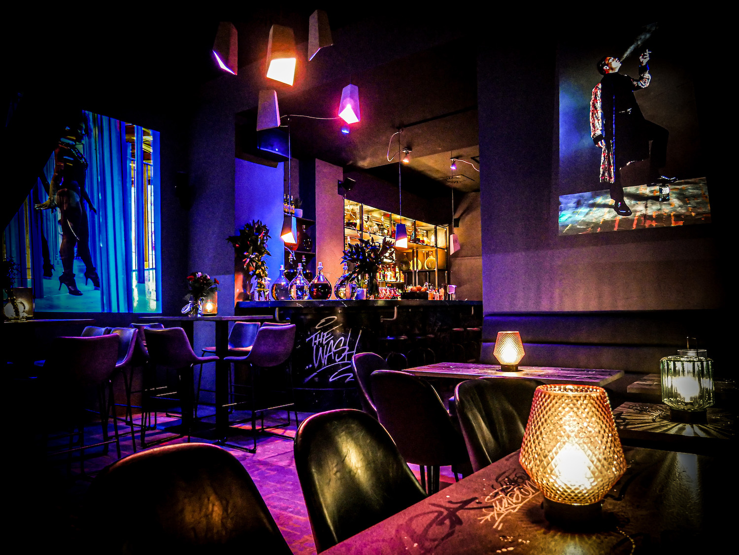 While the atmosphere is consciously rather dim, the interior is cool and modern. Besides an installation with actor David Schütter, pictures by photographer Christopher Schmidt are projected onto the walls. The tables and counter were designed by graffiti artist AkteOne to create a contrast to the cool ambience.