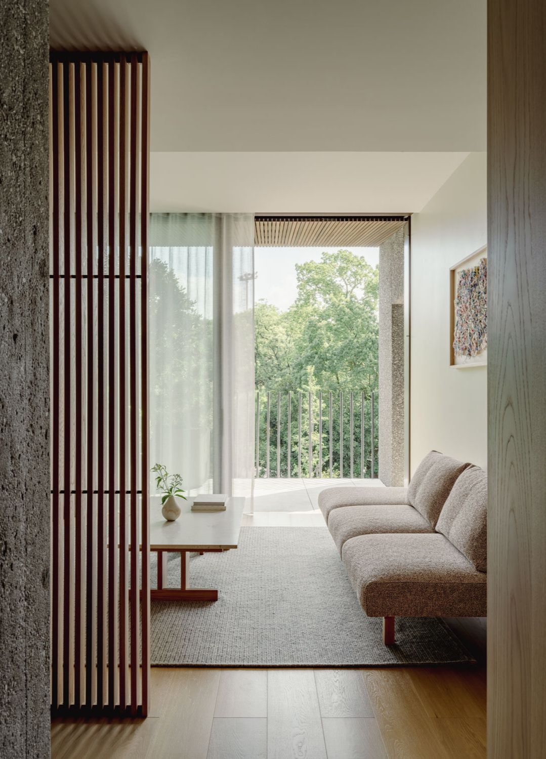 The concrete façade is adorned with lush plantings that create an arch to the nearby park. The foliage not only enhances the exterior, but also symbolizes the effort to create a peaceful sanctuary in the midst of the bustling city.