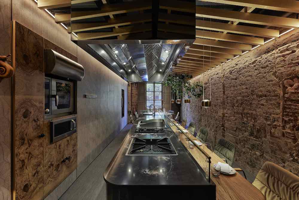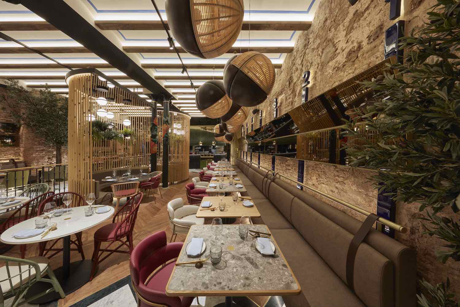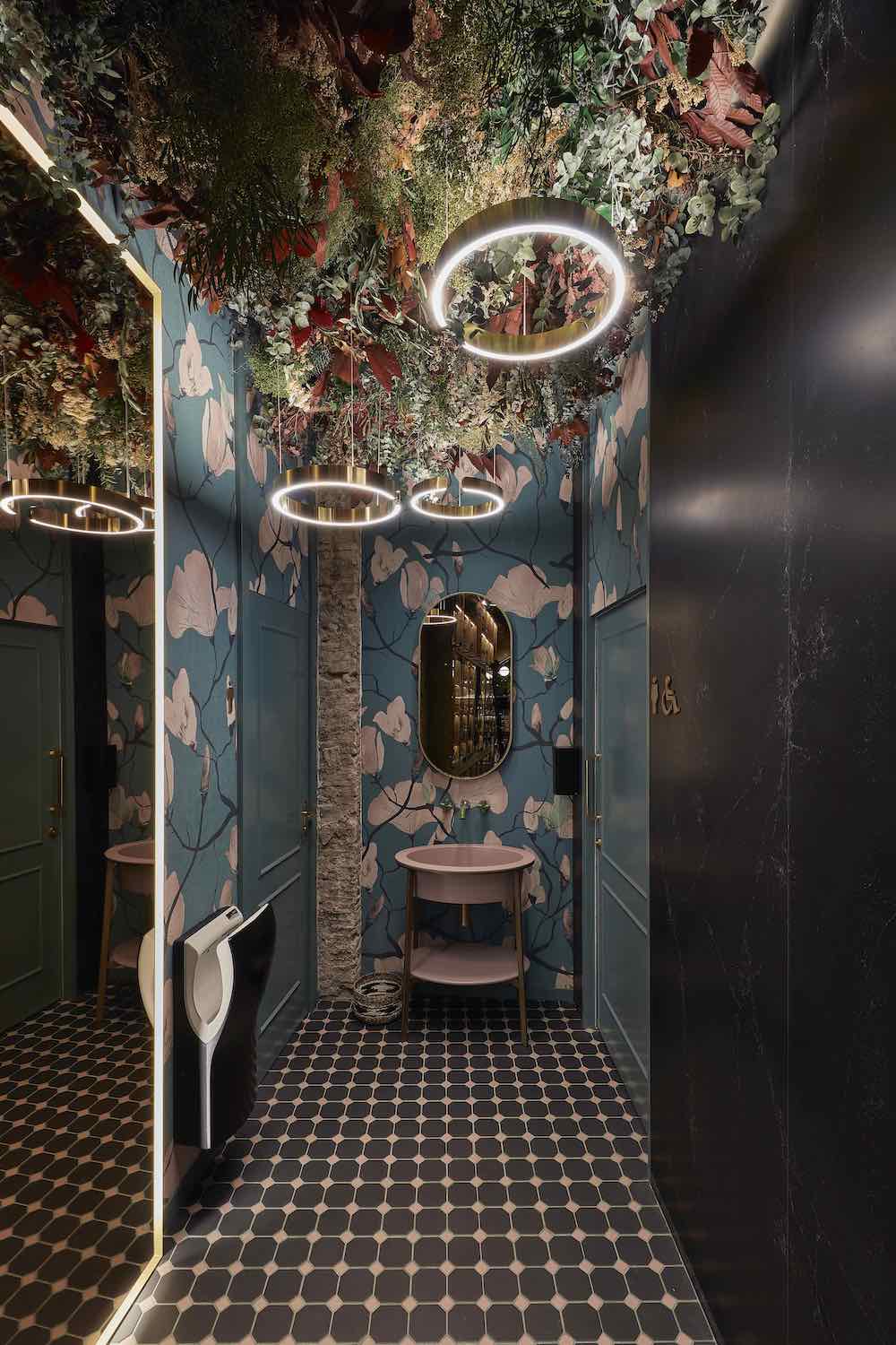 The charmingly designed restaurant, concepted by Valencia’s architecture and interior design studio Janfri & Ranchal presents itself in an inviting and cozy manner. The look is mainly marked by a contemporary aesthetic, whereby raw brick walls and warm wood tones assure that the design elegantly aligns with its historic surroundings. A special focus was placed on the look of the restrooms: They are colorful and imaginative and the opposite of the usual tile boredom.