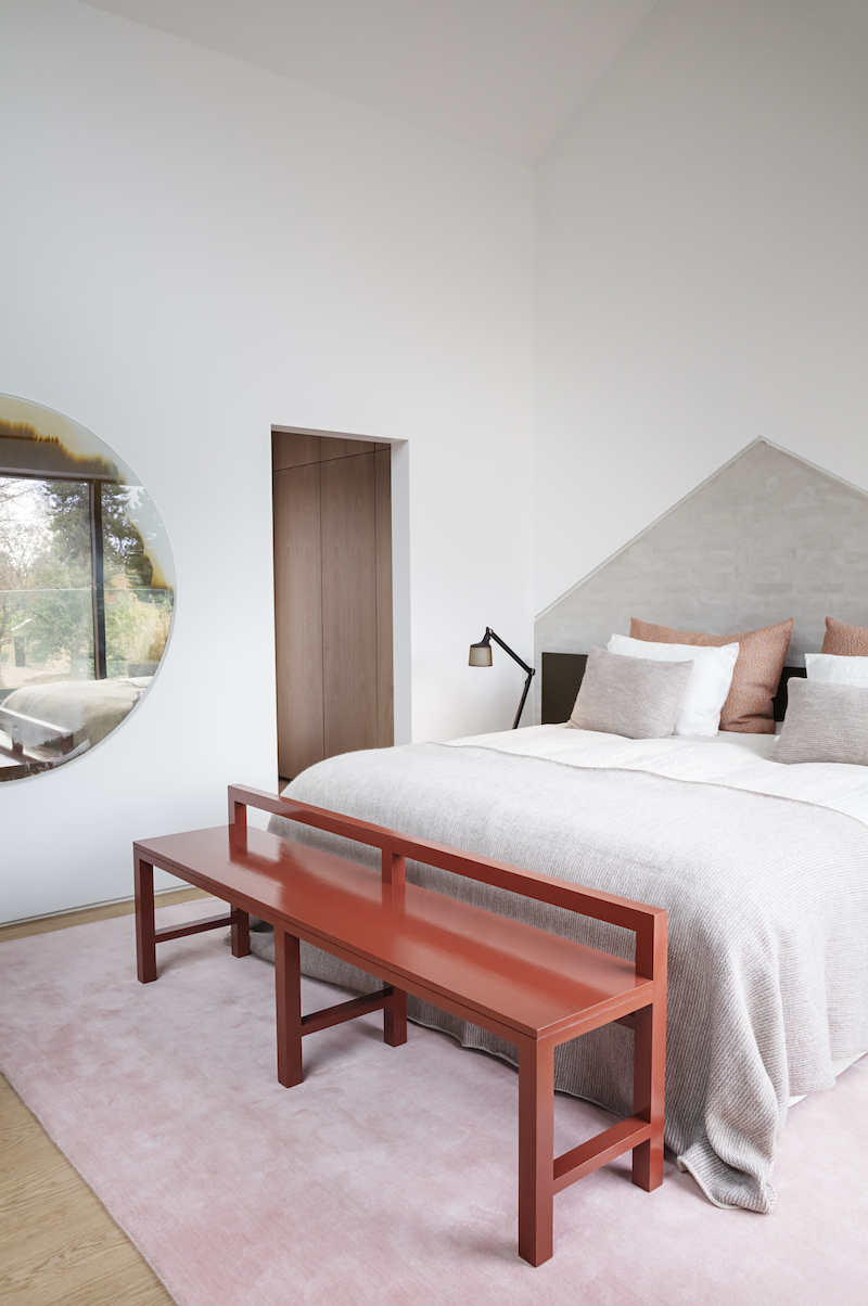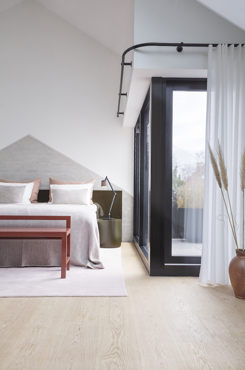The spectacular interior, showcase of the Tipp company, combines soft color shades of grey and pink with dark accents such as purple and black. Glass arched doors with steel frames, customized terrazzo floors, a modern steel staircase and the open access to a private terrace are essential architectural highlights of the Vipp Chimney House that opened in the summer of 2019. Two bedrooms, two bathrooms and a large open kitchen as well as dining and living rooms take up a space of only 200 square meters.