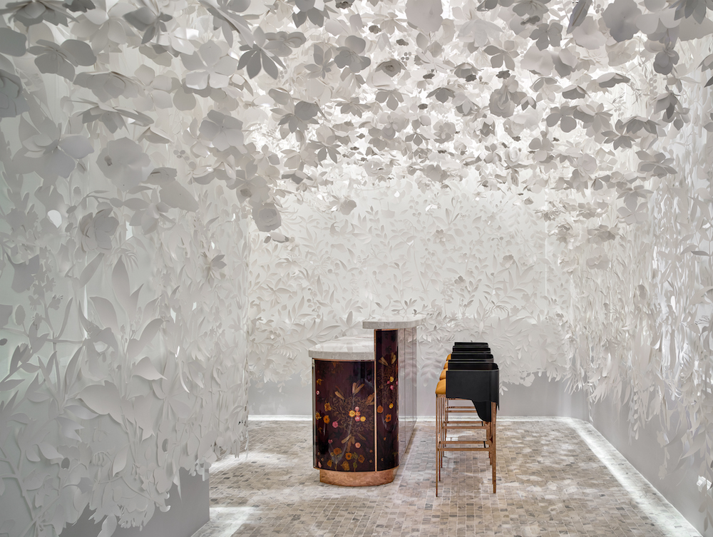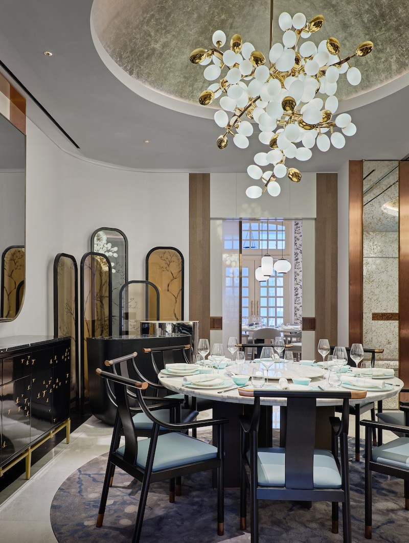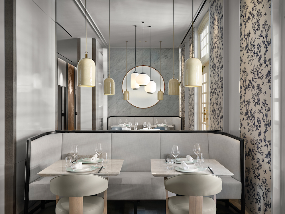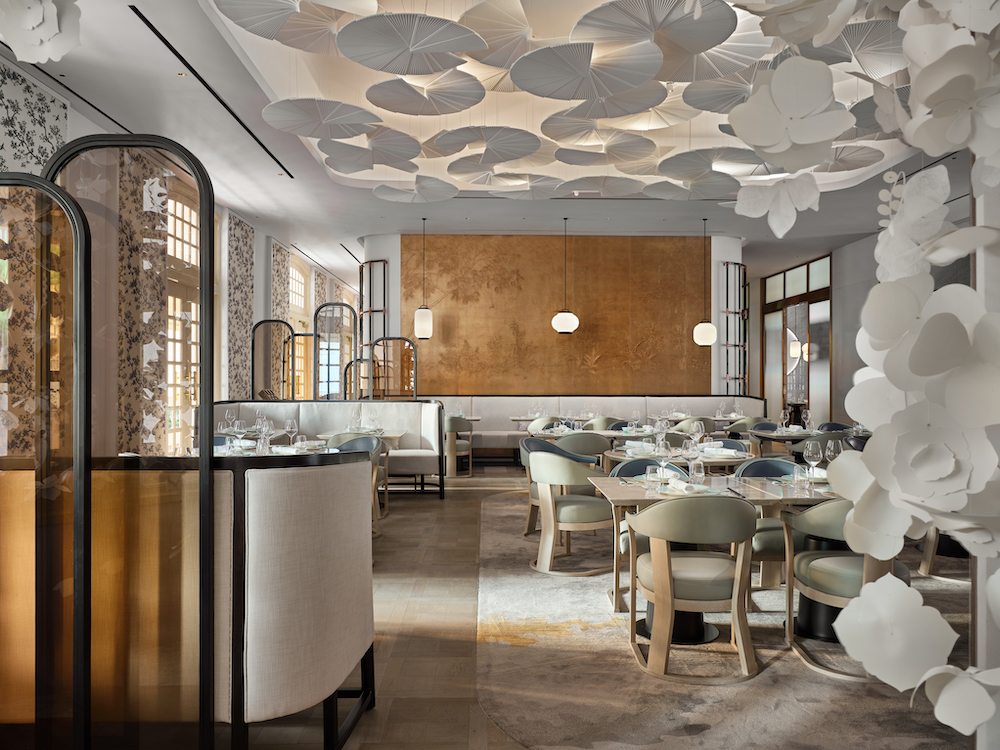 The top restaurant Yi by star chef Jereme Leung is located on the third floor of the restored Raffles Hotel Singapur. The entree is already impressive. Aedas Interiors and Toronto’s Studio Moss & Lam created a sculptural installation of flower elements that interprets Chinese mythology in the shape of a garden here. The concept earth dominates in the main dining room – and focuses on a refined palette of natural materials such as marble and wood.