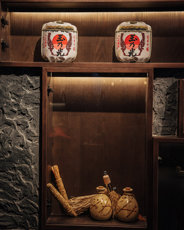 Die Verwendung von Rattan-Wandverkleidungen, rustikalen Texturen und groben Stein- und Holzvertäfelungen ist von traditioneller japanischer Architektur inspiriert. Wandprojektionen präsentieren eine visuelle Flucht in das Gado-Shita-Erlebnis.