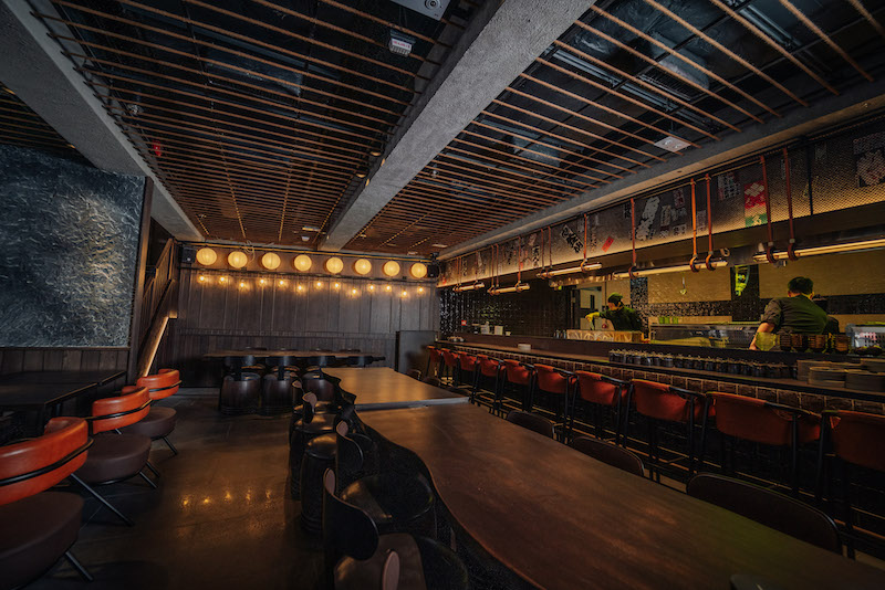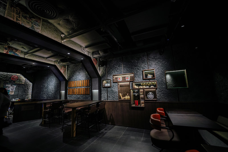 Tokios Gado-Shita, Bereiche unter Hochbahngleisen, und japanische Retro-Popkultur bestimmen das Design. Elemente der Bahnhöfe wurden an Bereiche des Restaurants angepasst, um die unterirdische Welt zu enthüllen.