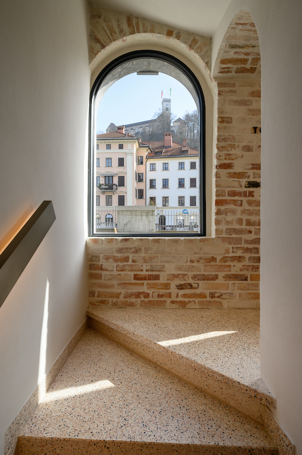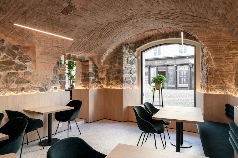 Klun’s interior designers drew particular inspiration from the original brick vault. Pleasantly soft lines characterize various pieces of equipment, the colors of the terrazzo floor are reflected in the furniture, and installations have been cleverly banished behind the surrounding wood paneling.