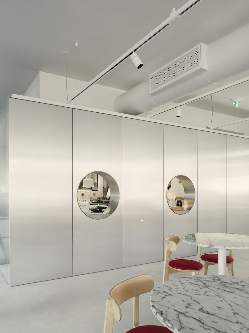 Strong color accents in furniture and small objects assure that. They stretch across aluminum sheets, cover almost all technical areas, remind of faded mirror walls.